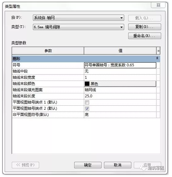 点击“属性”对话框中的“编辑类型”按钮→弹出“类型属性”对话框,进行设置轴网的设置。