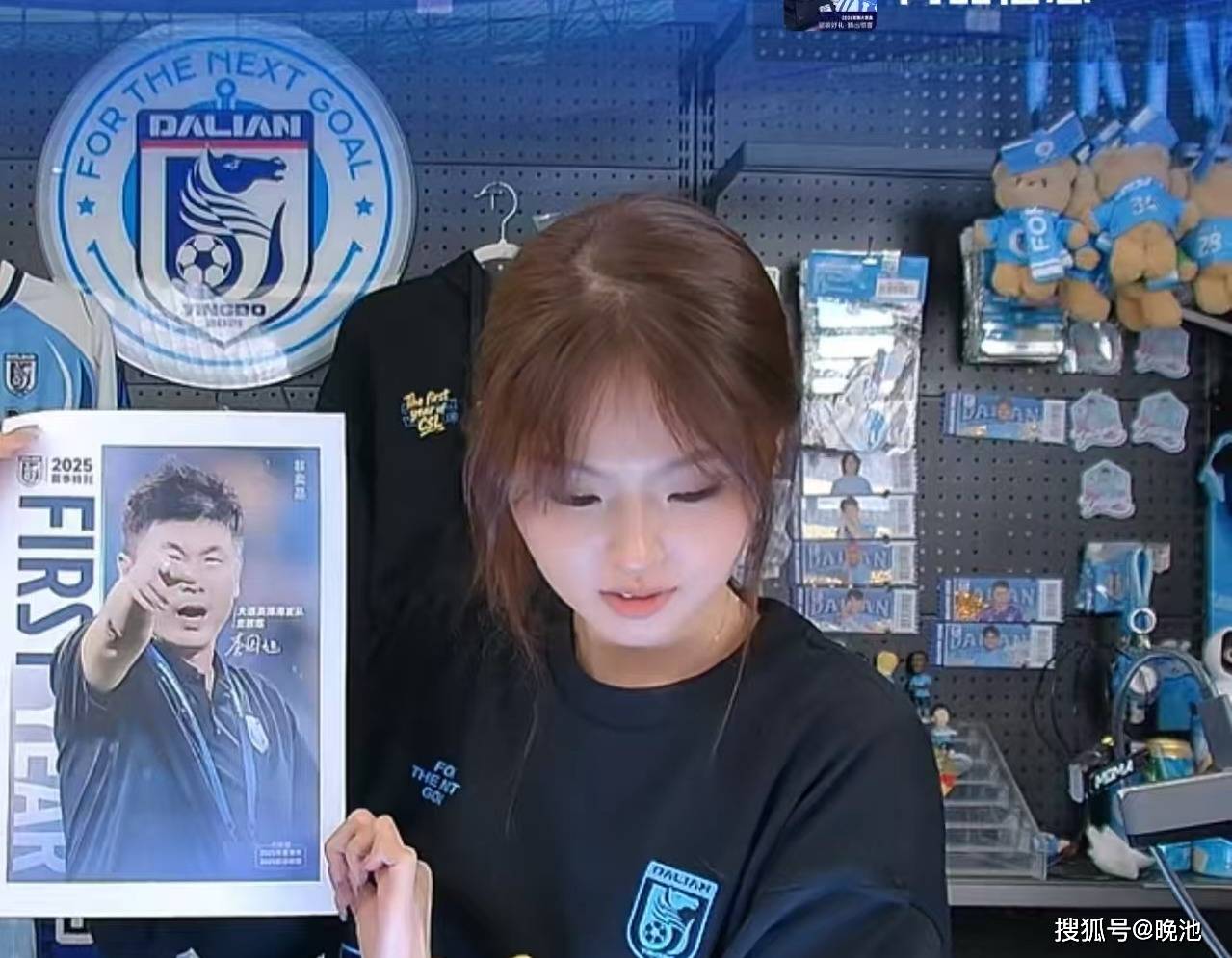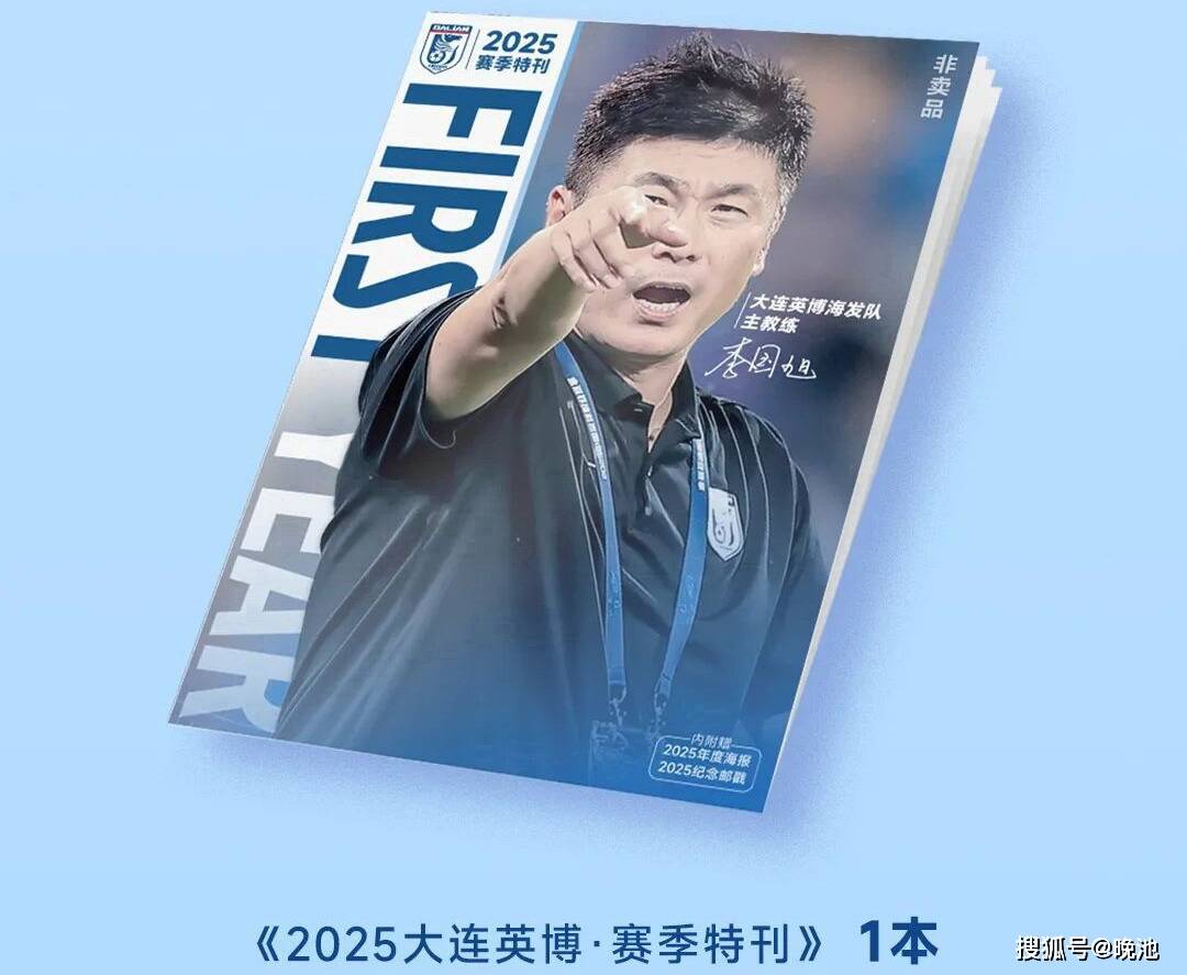 第一,《2025大连英博-赛季特刊》(一本),封面是大连英博管理团队三驾马车之一的一线队主帅李国旭。这本特刊是大开本,可参考大连英博文化传媒直播间截图。