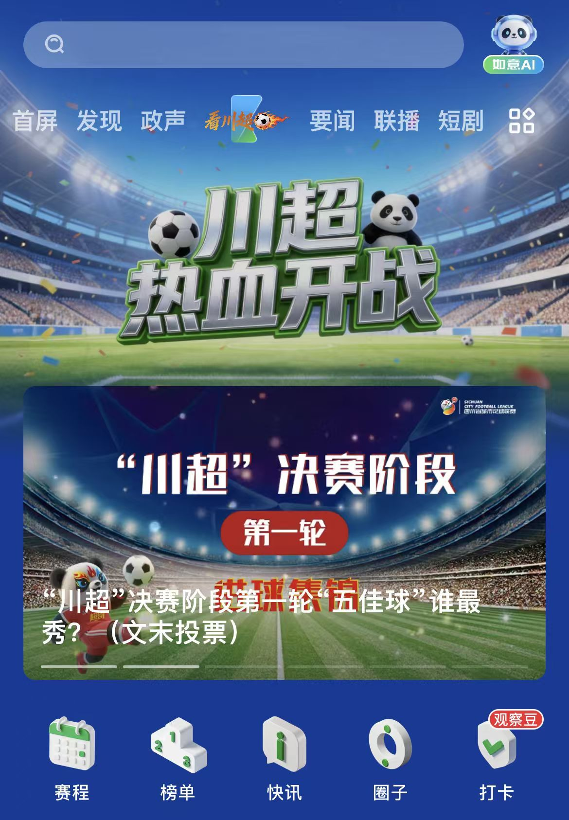 四川观察APP:首页点击进入【看川超】频道,享受全程直播+精彩回看+赛事资讯一站式服务。