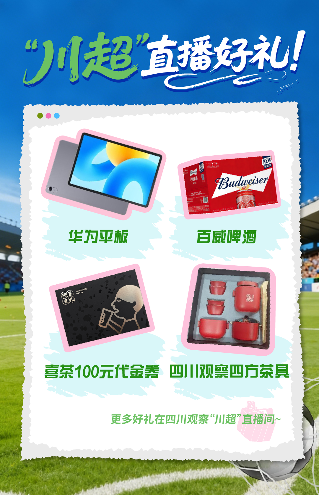 周六比赛开始前,我们将根据“本周最期待的川超比赛”投票结果,进行综合排名!综合热度最高的直播间,在直播间将抽取一位参与直播互动的幸运观众,送出华为平板一台!