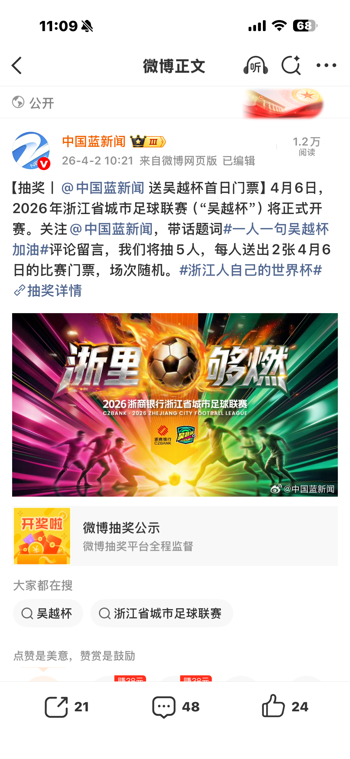 在微博发起#浙江人自己的世界杯#主话题,同步发起粉丝互动抽奖活动,围绕话题词#一人一句吴越杯加油#引导用户积极参与讨论,优质参与者有机会获得“吴越杯”专属门票。