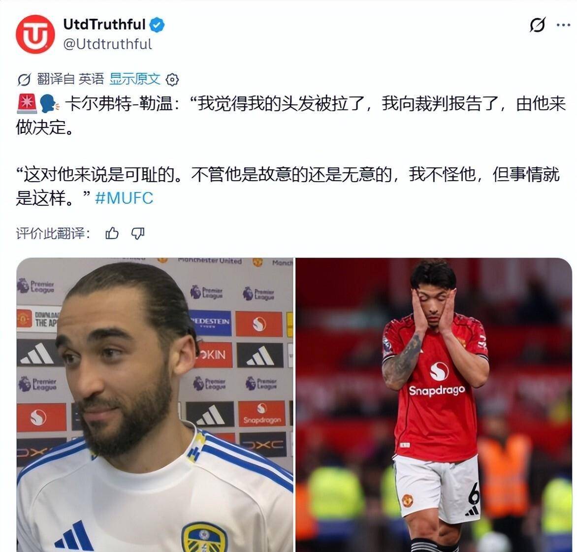 回到与利兹联的比赛,当利马因为拉扯头发被罚下时,社交媒体上迅速流传起另一张比赛截图。 那是本赛季早些时候另一场英超比赛中,一名球员在争抢中更用力、更长时间地拉扯了对手的头发,但当时主裁判认为那不是犯规,VAR也没有介入。 那张图片没有配任何文字,但所有球迷都明白其中的讽刺意味:同样的动作,甚至更轻微的动作,发生在曼联球员身上就是直红;发生在其他场合,就可能什么都不是。