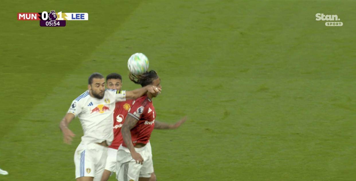 英超第32轮,曼联在老特拉福德迎战死敌利兹联。 比赛第5分钟,利兹联的第一次威胁进攻就带来了进球。 博格在边路起球传中,曼联年轻中卫约罗奋力起跳争顶。 就在他即将顶到球的瞬间,利兹联前锋卡尔弗特-勒温的手臂有一个明显的向后发力动作,手肘结结实实地撞在了约罗的后脑勺上。 约罗在空中失去平衡,争顶失败,皮球落到奥卡福脚下,后者轻松推射破门。 整个过程中,主裁判保罗·蒂尔尼没有任何表示,VAR也没有介入审查这个进球过程中是否存在犯规。