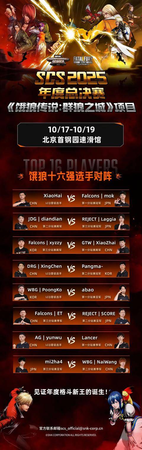 SCS 2025年度总决赛汇聚了全球顶尖格斗选手,阵容堪称豪华。在《拳皇15》项目中,小孩、Madkof(韩)、云雾、星辰、Pangma(韩) 等知名选手将展开激烈角逐。